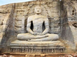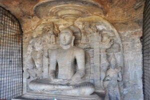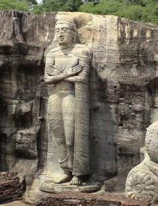 The Gal Vihara, also known as Gal Viharaya and originally as the Uttararama, is a rock temple of the Buddha situated in the ancient city of Polonnaruwa. It was fashioned in the 12th century by Parakramabahu I. The central feature of the temple is four rock relief statues of the Buddha, which have been carved into the face of large granite rock. The images consist of a large seated figure, another smaller seated figure inside an artificial cavern, a standing figure, and a reclining figure. These are considered to be some of the best examples of ancient Sinhalese sculpting and carving arts and have made the Gal Vihara the most visited monument at Polonnaruwa.